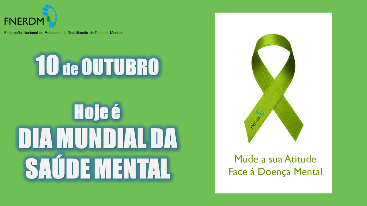 No âmbito da celebração do Dia Mundial para a Saúde Mental em 2023, a FNERDM está a organizar um abaixo-assinado PELOS DIREITOS DAS PESSOAS COM DOENÇA MENTAL NA COMUNIDADE, o qual será remetido ao Ministério da Saúde e Ministério do Trabalho, Solidariedade e Segurança Social.